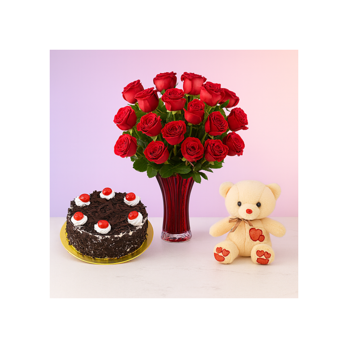 1.5 Kg Black Forest -6 Red Roses Bunch-Teddy Bear