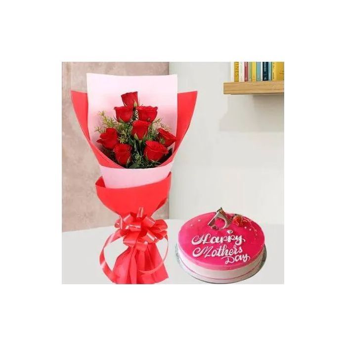 1 Kg Strawberry Cake with 6 Red Roses Bunch