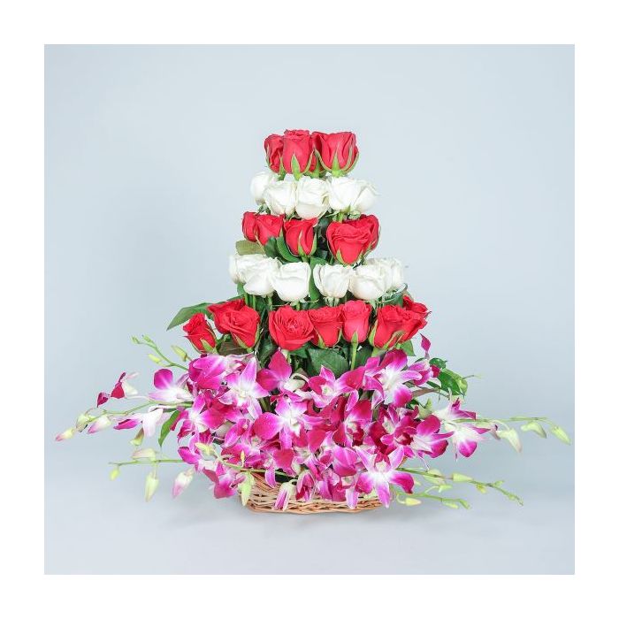 7 Purple Orchids 22 Red Roses n 14 White Roses Basket Arrangement