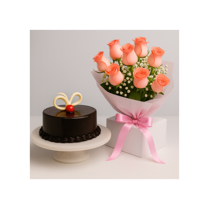 Chocolate Cake Half Kg with 12 Elegant Pink Roses Bouquet
