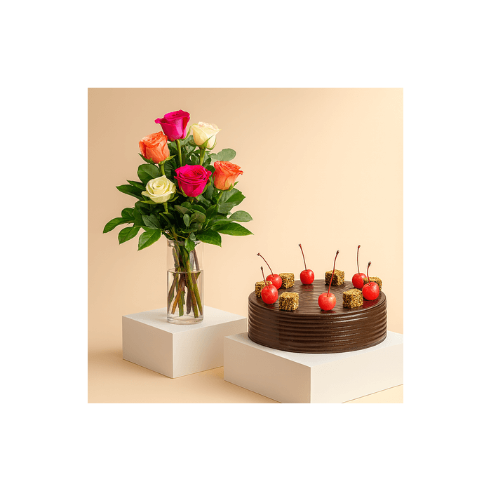 Chocolate Cherry Top Truffle Cake with 6 Mix Roses