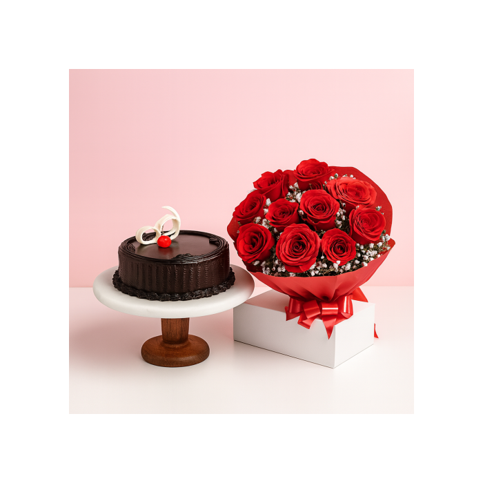 Classic Chocolate Truffle Cake Half Kgs with 6 Red Roses Bunch