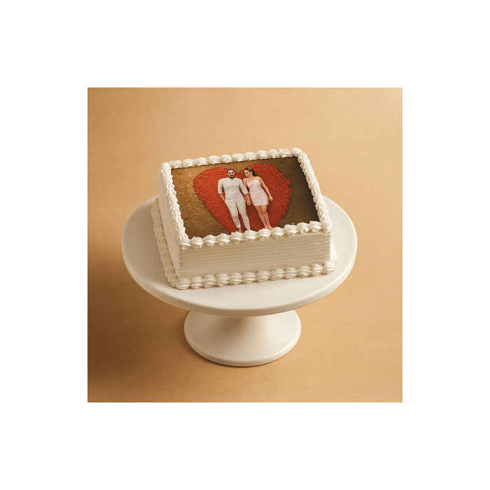 But what sets this cake apart is its personalized touch. The top of the cake features a high-resolution edible photo print of your choice, making it a unique and thoughtful way to celebrate your special day. Whether it's a cherished memory from your wedding day or a favorite photo from the past year, this photo cake brings your memories to life in the most delicious way possible.