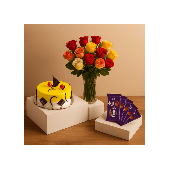 Eggless Pineapple Cake 1 Kg with 6 Mix Roses Bunch and 5 Chocolates