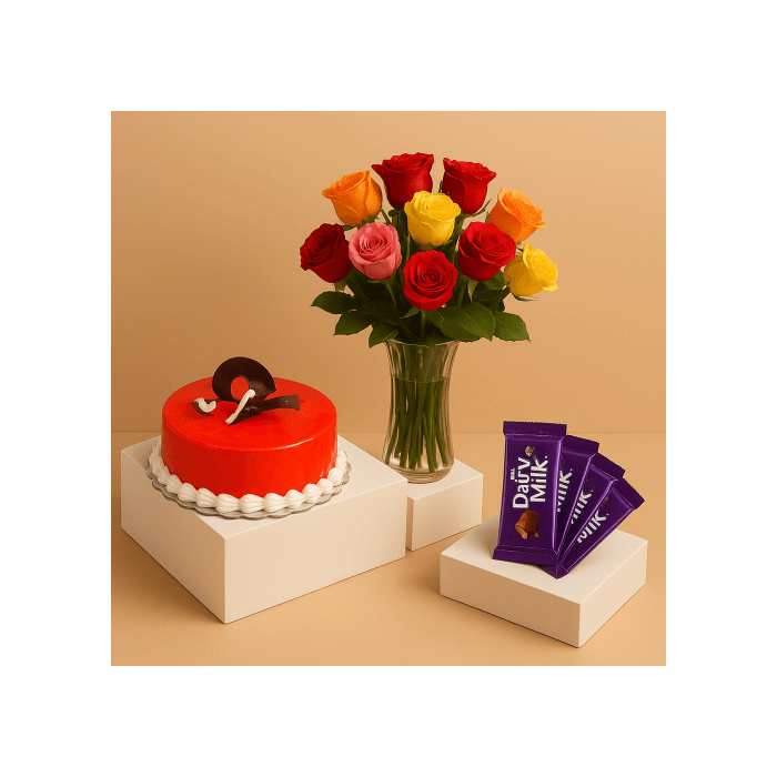 Eggless Strawberry Cake Half Kg with 6 Mix Roses Bunch and 5 Chocolates