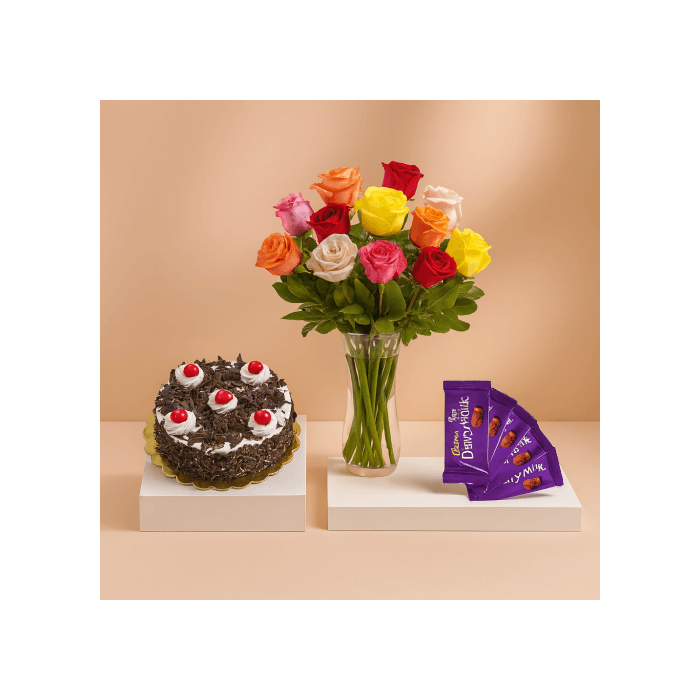 Half Kg Black Forest Cake-6 Mix Roses Bunch-5Chocolates