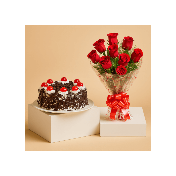 Half Kg Black Forest Cake with 12 Red Roses