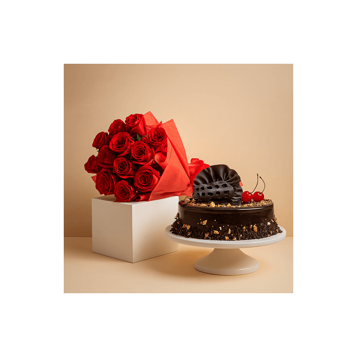 Half Kg Choco Almond Cake with 12 Red Roses