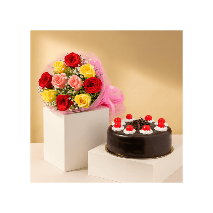 Half Kg Choco Black Forest Cake with 12 Mix Roses