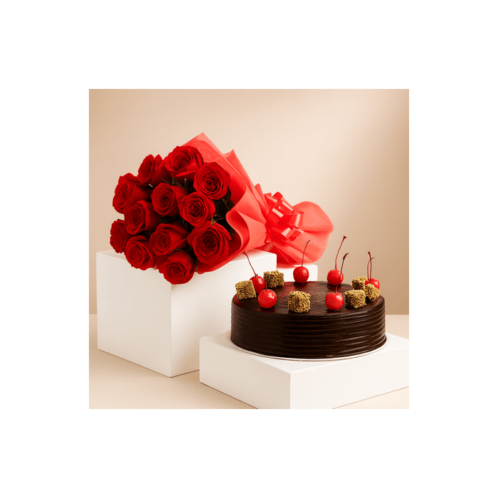 Half Kg chocolate Cherry Top Truffle Cake with 12 Red Roses
