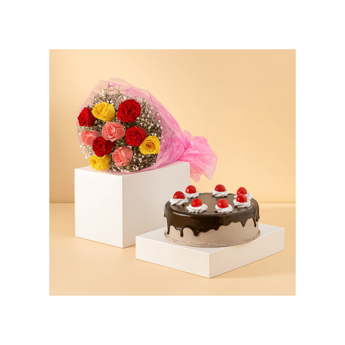 Half Kg Rich Black Forest Cake with 9 Mix Roses