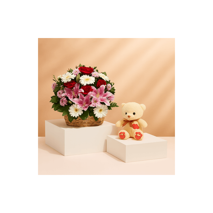 15 Mix Roses in Basket with Teddy Bear