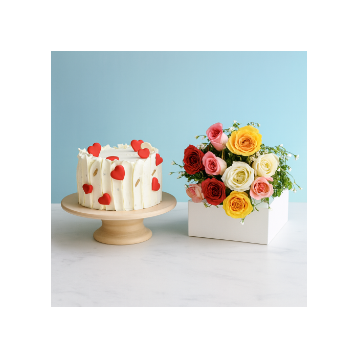 Pineapple Cake Half Kg with 6 Mix Roses Bunch
