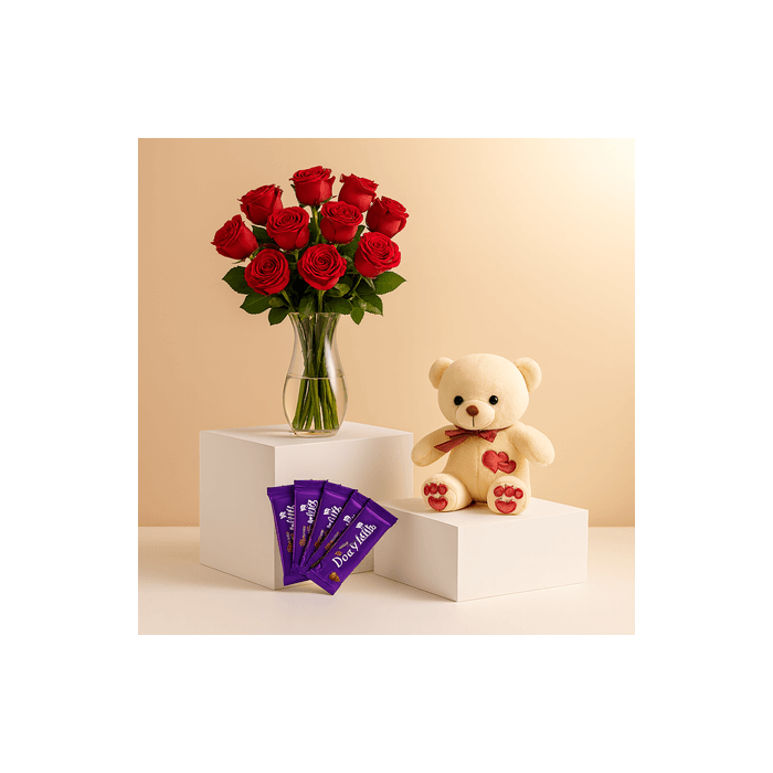 12 Red Roses And Teddy Bear With 5 Assorted Chocolates
